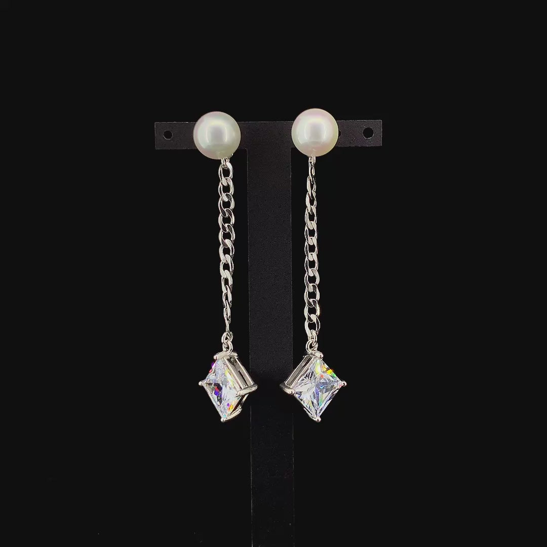 Zylver Pearl and Chain Drop Earrings with Zircon for Women - Sterling Silver Collection